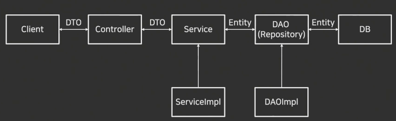 DTO는 데이터를 전달하기 위한 객체이다. 계층간 데이터를 주고받을 때, 데이터를 담아서 전달하는 바구니로 생각할 수 있다. Spring을 학습하면서 다음 계층 관계도를 참고했었다.