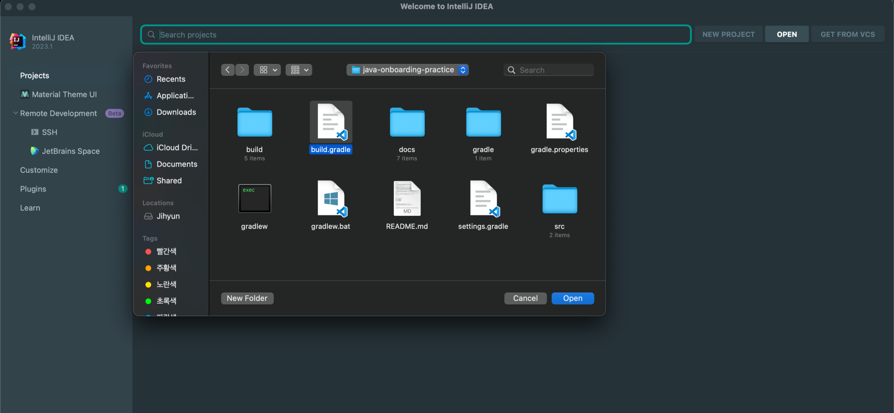 인텔리제이를 사용할 것이다. open을 눌러 프로젝트의 build.gradle을 선택했다.
