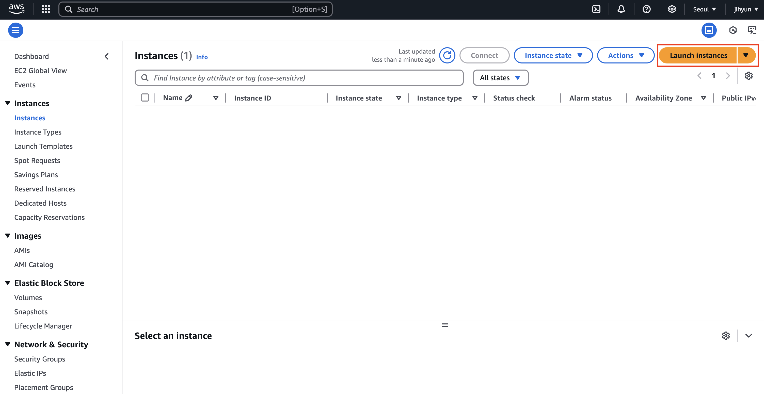 EC2 서비스에 들어가 "인스턴스 시작" 버튼을 누른다.