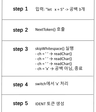 책에서 위 문장을 읽었을 때는 이해했다고 생각했다. 토큰화를 해야 우리의 소스코드를 인터프리터가 이해할 것이지 않은가. 하지만 막상 구현하려니 막막한 기분이 들었다. 'let x = 5;'라는 문자열을 어떻게 'LET', 'IDENT', 'ASSIGN'으로 나눌까? 공백은 어떻게 처리하지?