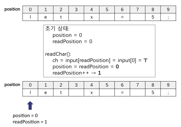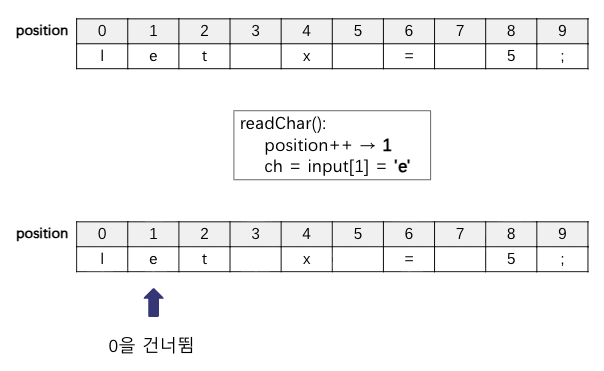 그런데 Lexer 구조체를 정의하면서 의문이 들었다. 왜 position과 readPosition 2개가 필요할까? position 하나로만 관리할수는 없을까?